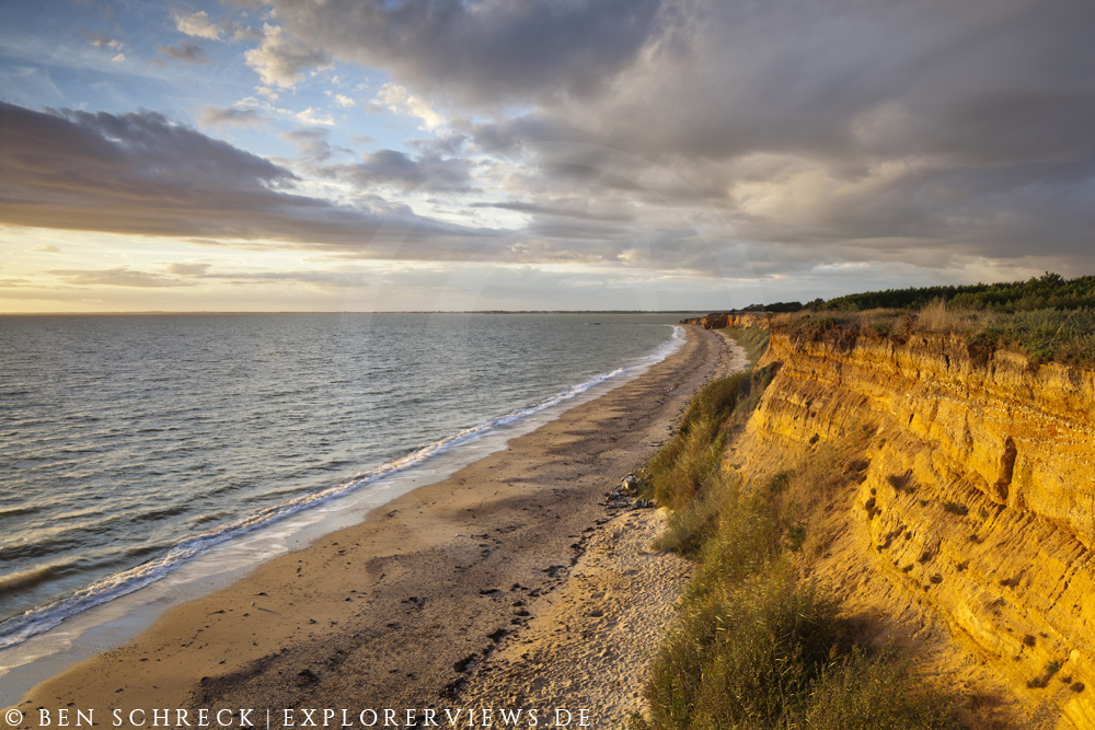 Unterhalb der Klippe breitet sich ein schöner Sandstrand aus, der zum Baden und zum Spazierengehen einlädt. Tagsüber wirkt das Gestein etwas matt, neigt sich die Sonne am Abend dem Horizont entgegen, präsentiert sich der Fels in seinem prächtigen Gewand.
