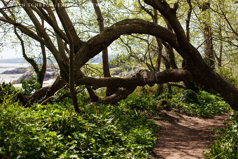 Dort angekommen führt ein schmaler Pfad vom Strand über Steine auf das Eiland. Der Weg verläuft durch ein kleines Stück Wald an dessen Ende der höchste Punkt der Insel ist.