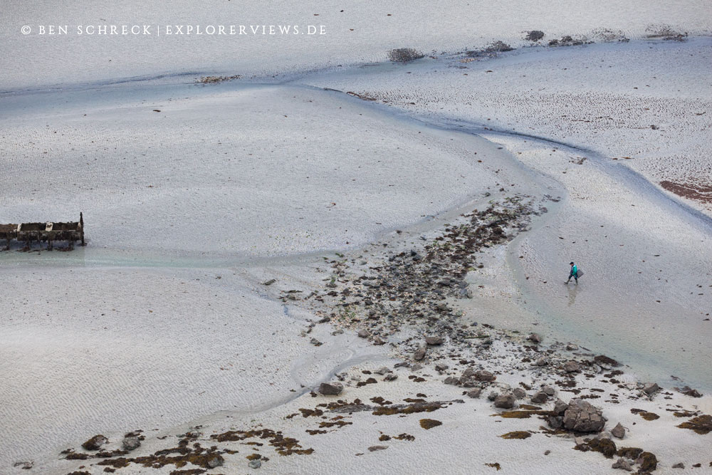 Die Flut kommt an manchen Stelle ziemlich schnell und verändert die Umgebung in kürzester Zeit dramatisch. Mir blieb nichts anderes übrig, als in das hüfthohe Wasser zu steigen und durch das kalte Nass vorsichtig an Land zu waten.