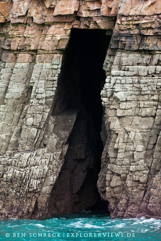 Das Foto der Meeresgrotte ist bei Ebbe aufgenommen. Der Wasserstand liegt bei Flut in dem Bereich weiter oben, wo der Fels von Grau ins Rote wechselt. Das sind hier geschätzte 10 Meter. So viel schwankt der Meeresspiegel an einem einzigen Tag – zwei Mal!