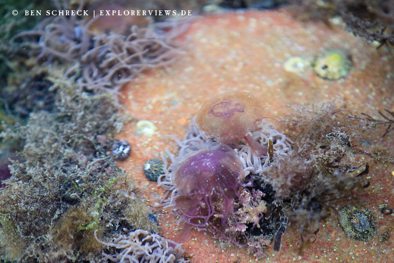 Eine andere Wanderung ist nur bei Ebbe möglich. Wenn sich das Wasser zurückgezogen hat, kommt für wenige Stunden eine einzigartige Landschaft zum Vorschein. Dann ist es möglich zwischen Sand und Fels über den Meeresboden zu laufen und in kleinen und großen natürlichen Wasserbecken das Meeresleben zu beobachten.