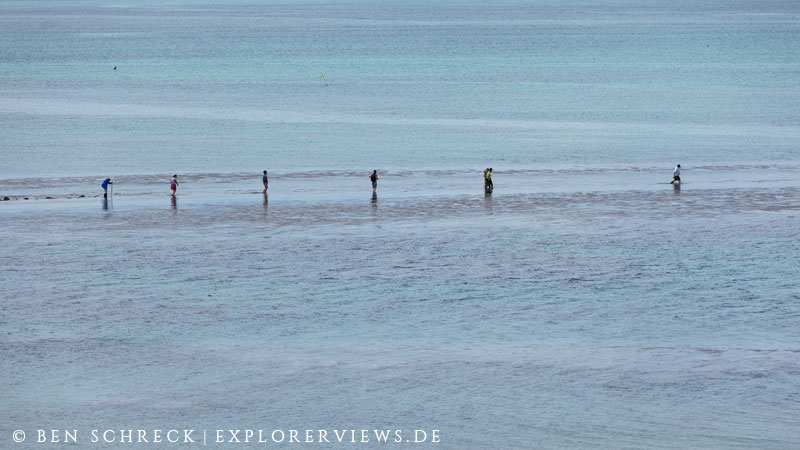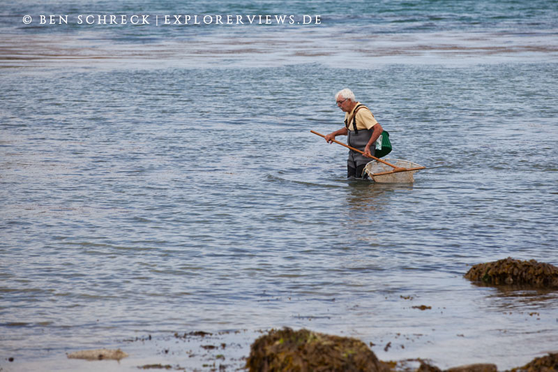 Genau zu dieser Zeit rücken die Einheimischen mit Korb und Netz aus, zum Pêche à pied, Fischen zu Fuß. Dabei werden Muscheln, Austern, Krebse und was sich sonst noch in den Becken und an den Felsen der Küste findet, gesammelt. Dabei aber nie vergessen, dass die Flut irgenwann wieder kommt.